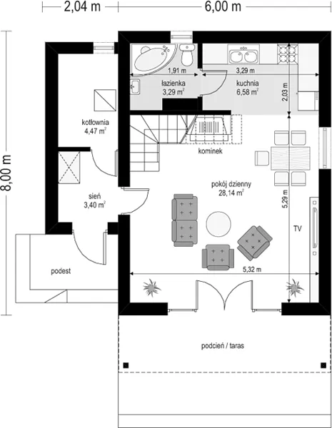 - Otwarty salon połączony z aneksem kuchennym zapewnia przestrzeń do wspólnego spędzania czasu i relaksu, a także umożliwia aranżację według indywidualnych potrzeb.