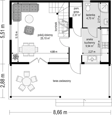 - Powierzchnia użytkowa: Projekt „Przepiórka” oferuje optymalną powierzchnię, zapewniając komfort dla małej rodziny lub pary. Starannie przemyślane rozmieszczenie pomieszczeń pozwala w pełni wykorzystać każdy metr kwadratowy.