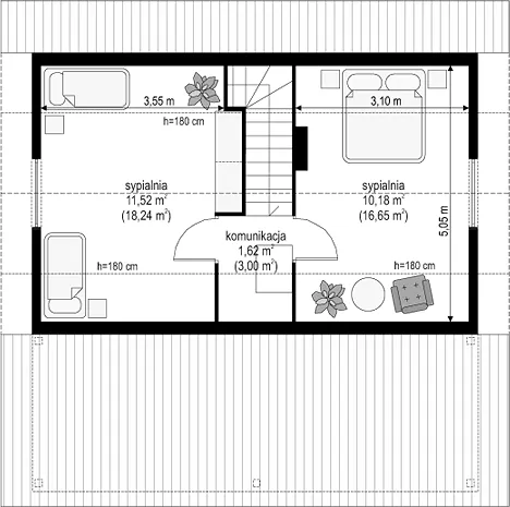 Sypialnia 2 (10,18 m² – powierzchnia użytkowa, 16,65 m² – po podłodze):